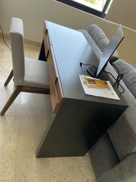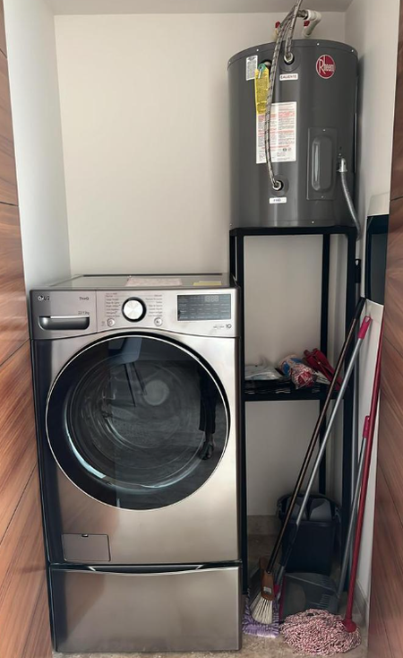 Cocina integral con parrilla eléctrica, campana extractora y cubierta de granito.