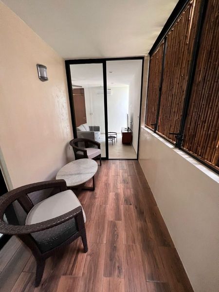 El departamento tiene una terraza súper cómodos que tiene puertas de bambú que permiten la entrada de luz y el aire, pero que mantienen súper fresco el departamento.