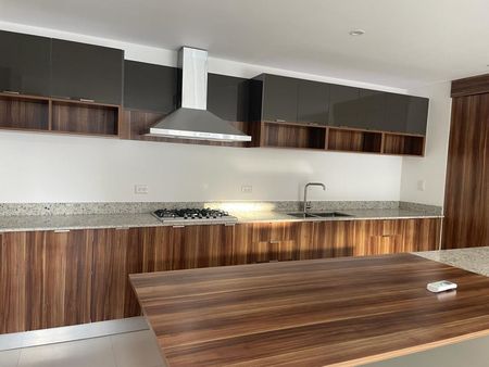 -Cocina abierta con gavetas, alacena y barra de granito, incluye estufa, horno y campana