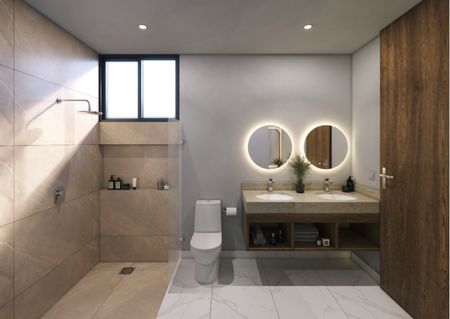 gabinetes inferiores y superiores en cocina, espejos de baño