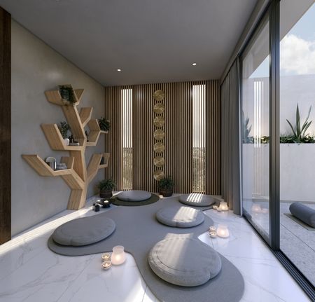 meditación, área de terapia, gimnasio, área de fogata, grill bar y alberca.