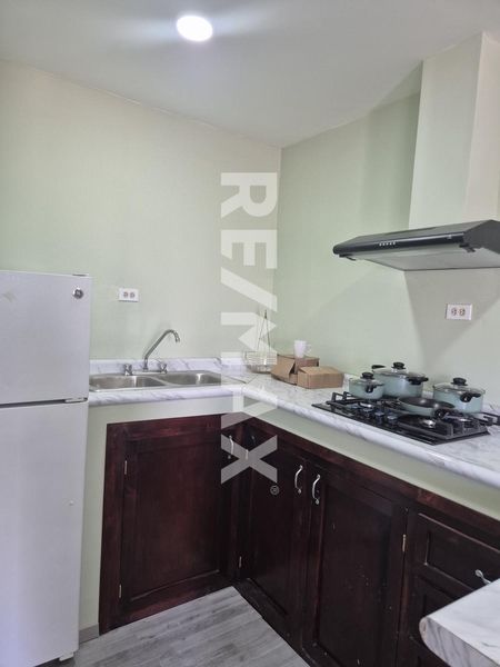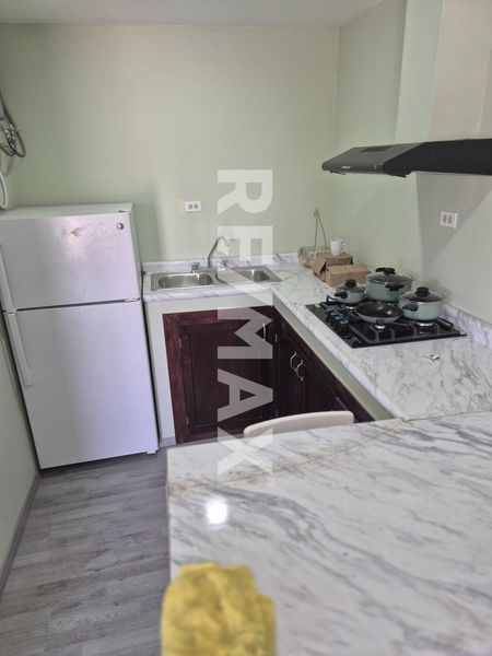 Cocina integral equipada con estufa,refrigerador,extractor.