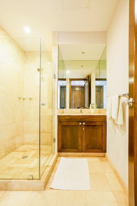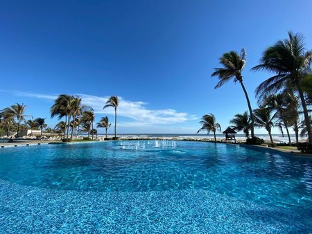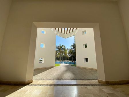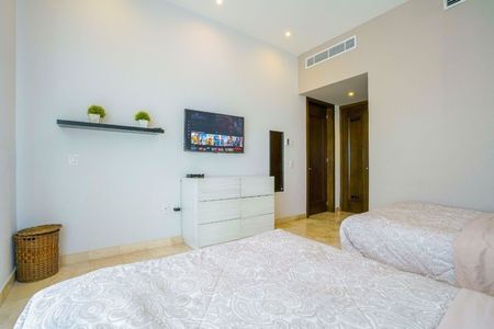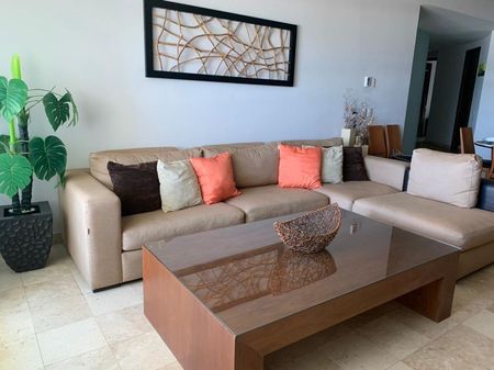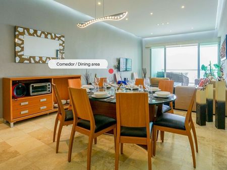 3 recámaras con baño y balcón, la principal con vista al mar y jacuzzi. Baño de visitas. Cocina integral equipada con barra y campana. Comedor y sala con grandes ventanales que dan a la terraza con vista a las albercas, al mar y a la puesta del sol. Cuarto de servicio con baño completo.