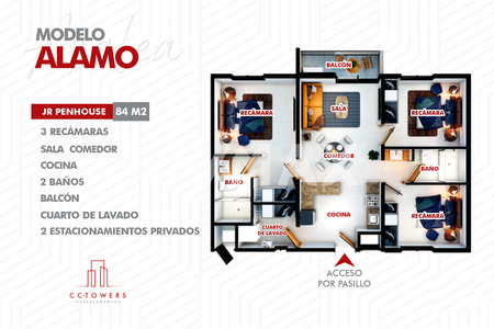 Departamento en condominio tipo vertical cuenta con 2 Recámaras, sala, comedor, cocina, baño, balcón, cuarto de lavado, 2 estacionamientos privados, las amenidades con las que cuenta son: roof garden, alberca, gimnasio funcional, centro de negocios, control de acceso, asociación civil, acceso controlado, los puntos de interés son: restaurantes de comida rápida, bancos, estaciones de gasolina, gimnasios, centro de la ciudad, oficinas de gobierno, supermercados, farmacias, hospitales, cruces fronterizos, centros comerciales, zona turística. CONSTRUCCIÓN: 82.09 M2 TORRE CACHANILLA - NIVEL 6 - UNIDAD 612 - MODELO ALAMO
