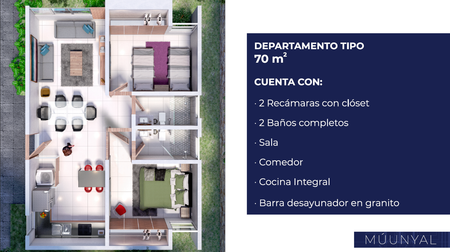 MÚUNYAL cuenta con un modelo, "Departamento tipo", variando solamente los ubicados en la planta baja los cuales incluyen una pequeña área exterior en estancia como de remate decorativo.