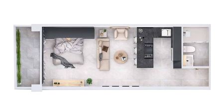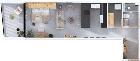- **Estilo Moderno y Elegante:** La estética minimalista y contemporánea utiliza una paleta de colores gris y materiales como concreto pulido, acero y vidrio, proporcionando un aspecto sofisticado y atemporal.