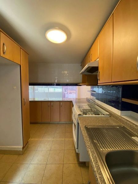 -Cocina equipada con cubierta de granito, barra desayunadora y alacena.