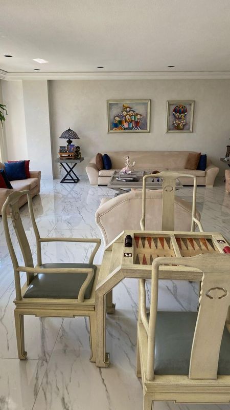 Sala, comedor, antecomedor y cocina completa con vista a los jardines .