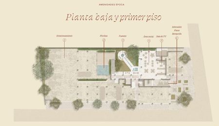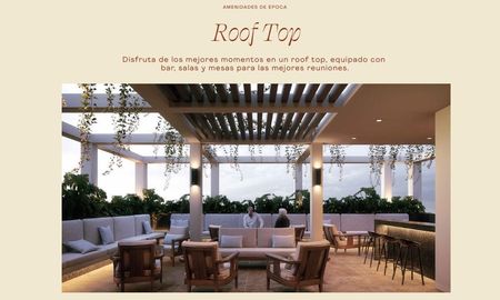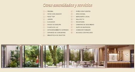 Lobby, Biblioteca de objetos, Área social techada, Coffe & Juice bar, Jardín Central, Estacionamiento privado, Rooftop con área social, Terraza con asador, Suite de invitados, sports bar, Área para recepción, Piscina en primer nivel, Elevador, escaleras de servicio, servicio de concierge, cámaras de seguridad.