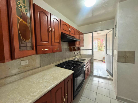 La propiedad cuenta con dos recámaras con clóset, un baño completo y un área de lavado independiente. Sus interiores ofrecen pisos de loseta cerámica, muros con acabado texturizado y recubrimientos de mosaico en cocina y baño. El plafón liso con detalles decorativos y la carpintería de madera en clósets y cocina aportan un estilo cálido. Gracias a sus ventanas, la estancia y las recámaras reciben abundante luz natural y ventilación.