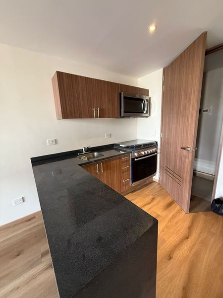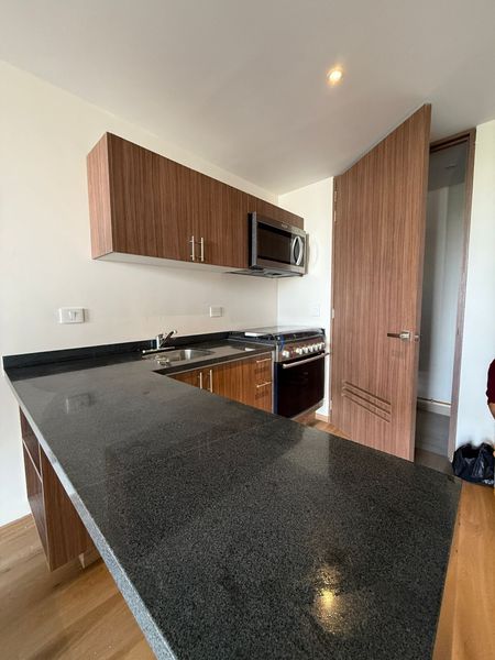 Cocina integral equipada con horno de microondas sobre campana de estufa