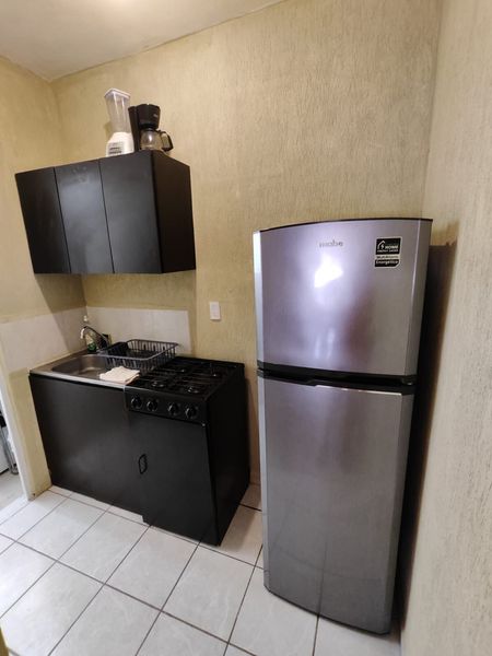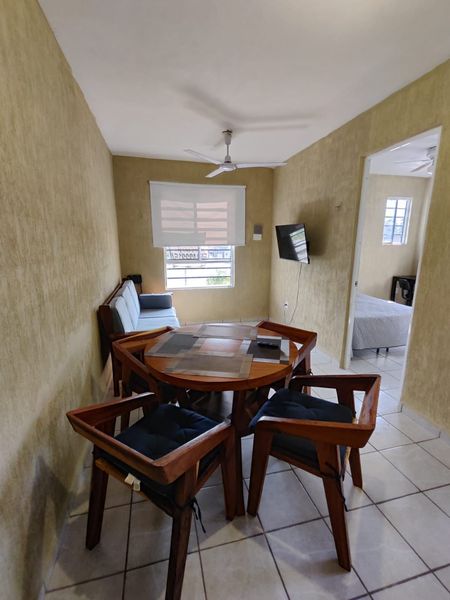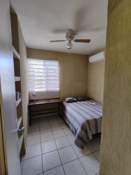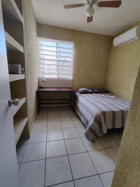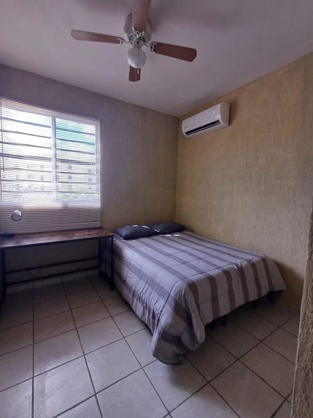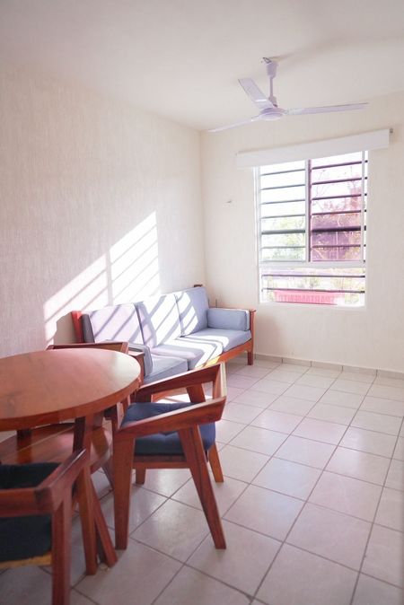 Ubicado en el 1 nivel, cuenta con Cocina integral con acabados de madera, Todos los artículos para cocina (Cafetera, licuadora, vajilla, etc.),Aires acondicionados, Ventiladores de techo, Closets de Tablaroca, 2 recamaras, espacio para sala y comedor, persianas en todo el departamento, cámara de seguridad instalada y acceso a alberca.