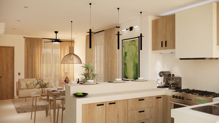 Sala, comedor, cocina en concepto abierto, Cocina con barra desayunador con barra de cuarzo, Medio baño, Lavandería