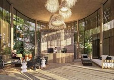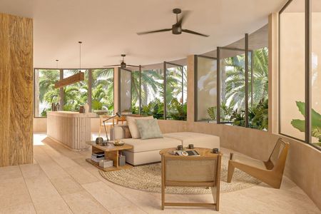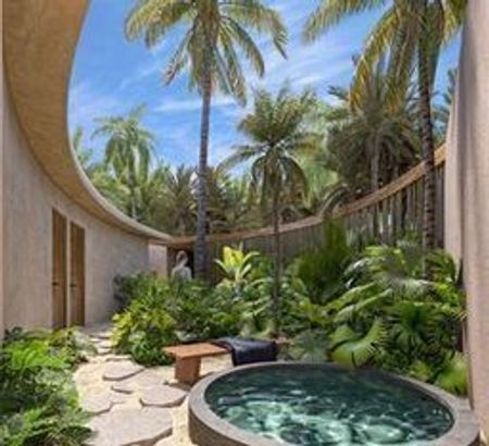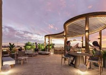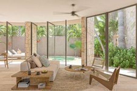 Terrazas techadas, pool, área con deck de madera, vegetación endémica.
