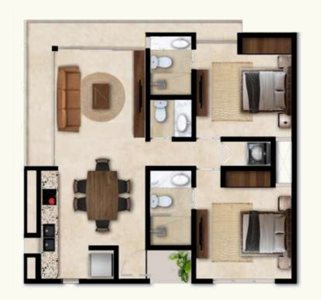 Piso de porcelanato con zoclo, Concreto lavado en área del balcón, Muros y pladones con acabado de rich, yeso directo y pintura vinílica, Cocina con granito modelo mont blanc color blanco o similar, Baños: Mármol modelo fiorito o similar, Carpintería: puertas y clóset de encino con bastidor de pino color natural, Cristal templado en ducha, Incluye contracanasta y fregadero de tarja, Mueble debajo de lavabo, parrilla eléctrica y campana, Mosquiteros en sala y recámaras.