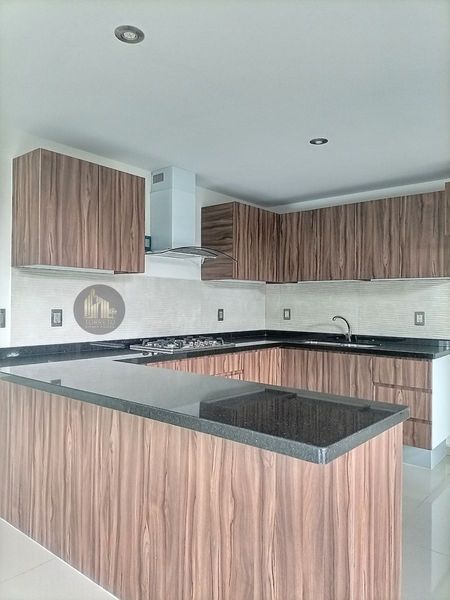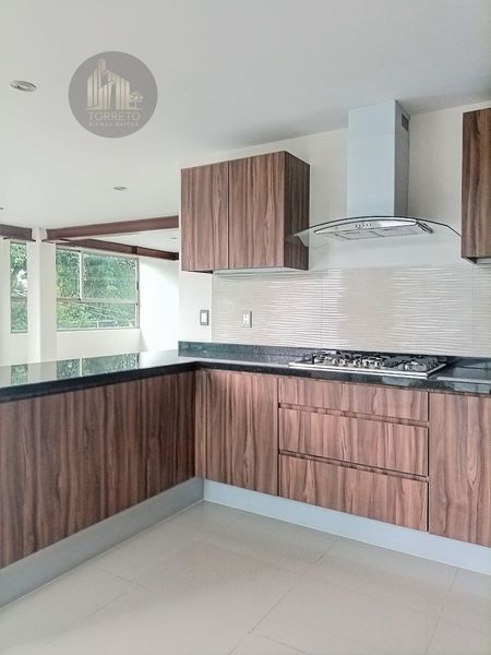 La cocina abierta cuenta con cubierta de granito y amplia barra desayunadora de granito ideal para 5 periqueras y espacio para un amplio refrigerador con toma de agua.
