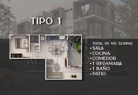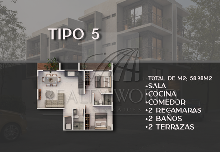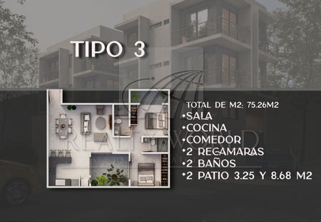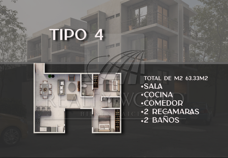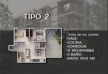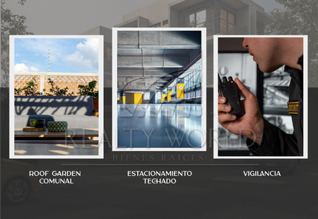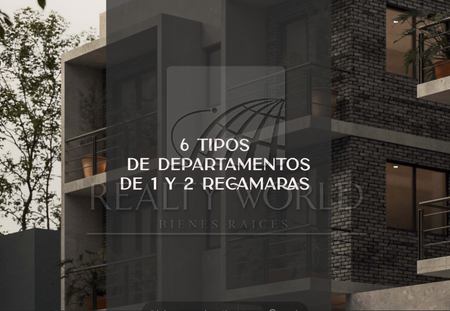 Desarrollo de nueve departamentos desde 52m2 hata 75m2 con 6 tipos de departamentos de una y dos recámaras, roof garden comunal, estacionamiento techado, vigilancia.