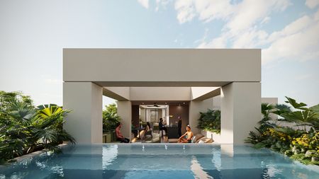 Lounge bar, Sala de juntas, Área de yoga, Gym, Asoleadero, Piscina, Área grill, Lobby, Elevadores.