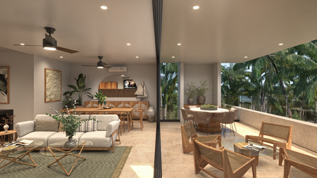 • Sala, comedor y cocina corridos con isla
