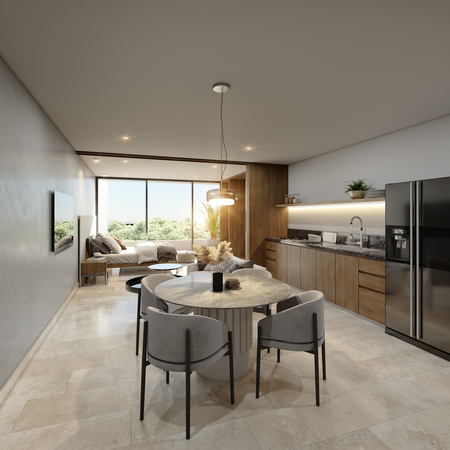 Esta opción cuenta con una acogedora recámara y amplias áreas sociales con balcón, brindando comodidad, privacidad y amplitud.