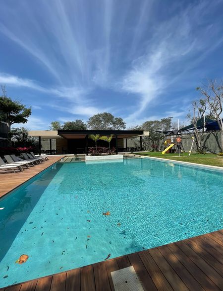 Amplia área común con alberca y bar, ideal para disfrutar y socializar. Chapoteadero y piscina muy amplia de 12.60 * 10.20, zona de camastros, caseta de vigilancia 24h, sus servicios de cableado son subterráneos, calles de concreto.
