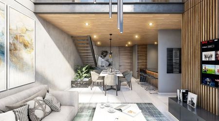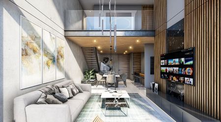 Comedor y sala con techo de doble altura.