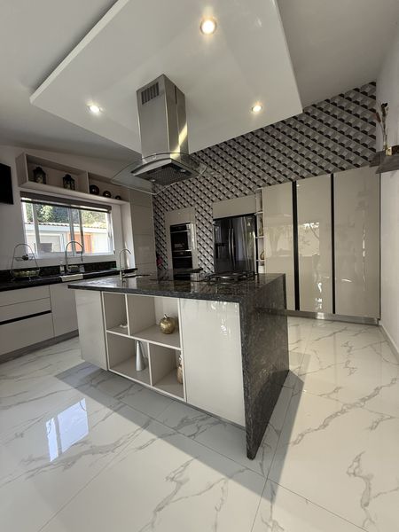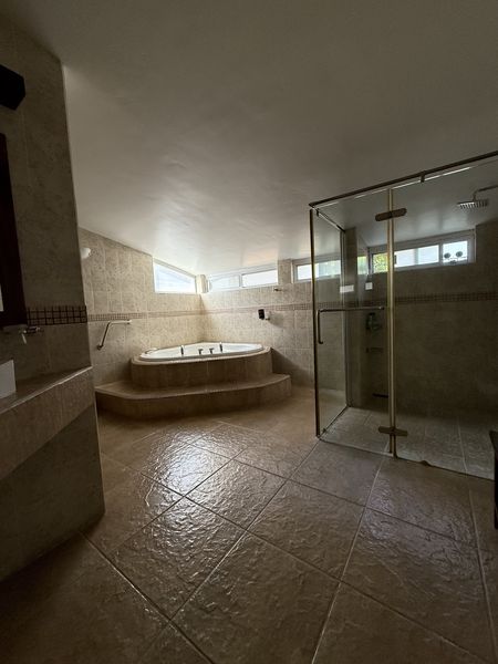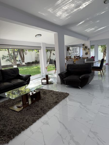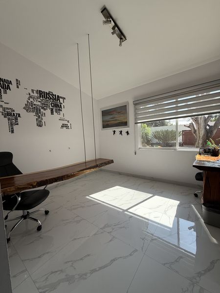 Cuenta con 5 recámaras, 3 de ellas distribuidas una en planta baja con vestidor y baño con jacuzzi, persianas eléctricas, las otras dos en la planta alta, cada una con su baño, también en planta alta, una oficina, en planta baja área de televisión y estudio con baño completo.