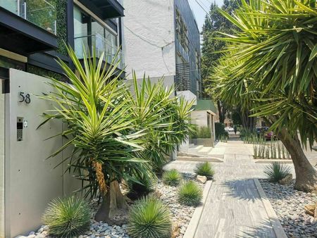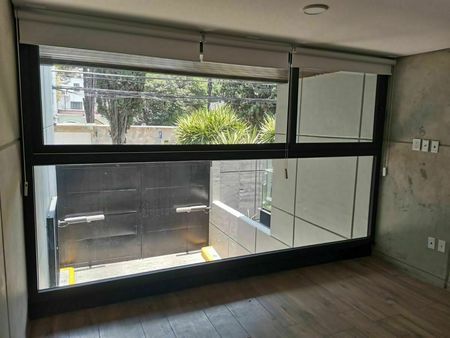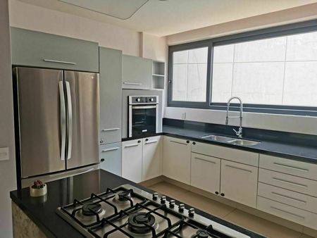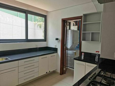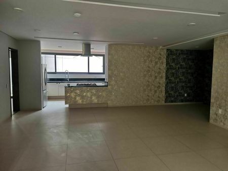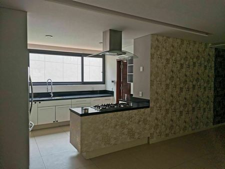 180 m2, cocina integral equipada abierta con refrigerador y horno, cuarto de lavado con centro de lavado y cuarto de servicio con baño completo, 1 recámara principal con patio chiquito muy lindo con cortinas con vestidor muy grande, bodega ahí mismo, 1 recámara secundaria con baño y clóset, 1 estudio o family room muy bonito, 2 estacionamientos, sala y comedor con un espacio para bar y un balcón, medio baño, vigilancia 24 hrs, cámaras cctv, 1 por piso, son 4 depas