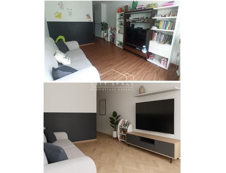 Tiene una amplia estancia para sala y comedor con pisos de madera.