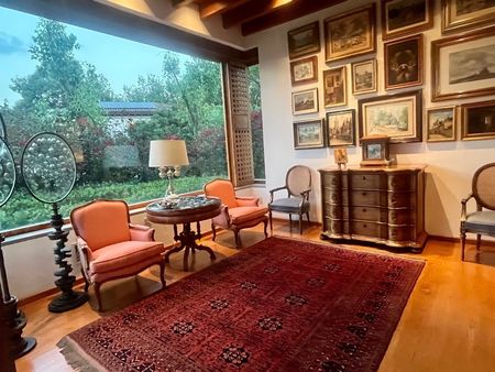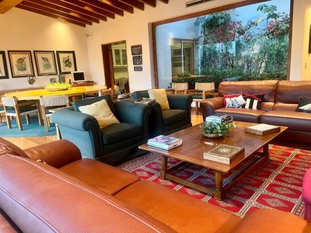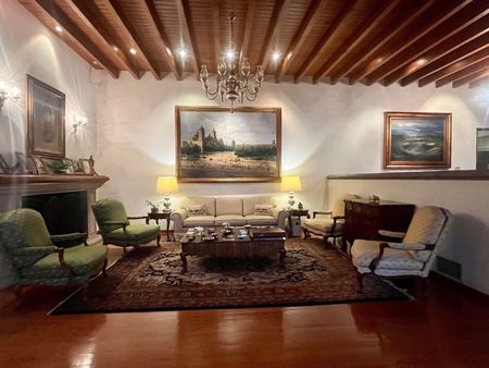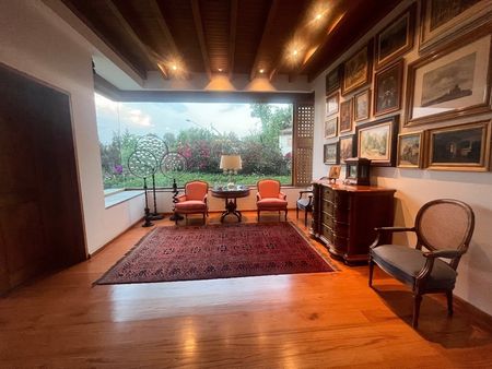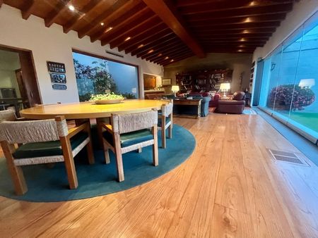 Residencia de lujo en calle cerrada con seguridad y con acabados de primera, excelente iluminación y orientación. techos altos con vigas de madera. Cuenta con alberca techada con sistema de nado contra corriente, 2 vestidores con baño y regaderas ,precioso jardín , biblioteca, elevador, gran family con bar y con salida al jardin. cuarto de juegos , garage techado para 16 coches ideal para coleccionistas. sala de TV acondicionada como sala de cine. amplia recamara ppal con sala u oficina. cuarto de servicio y lavandería Además cuenta con paneles solares.