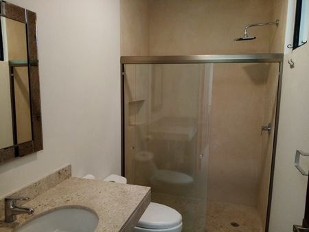 Baño con lavamanos de mármol y cancel de vidrio templado
