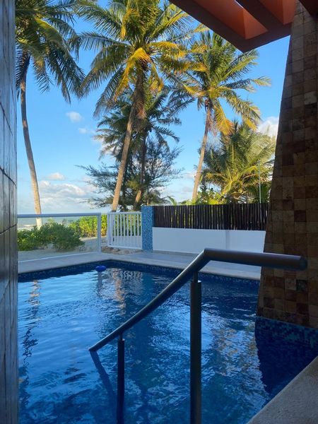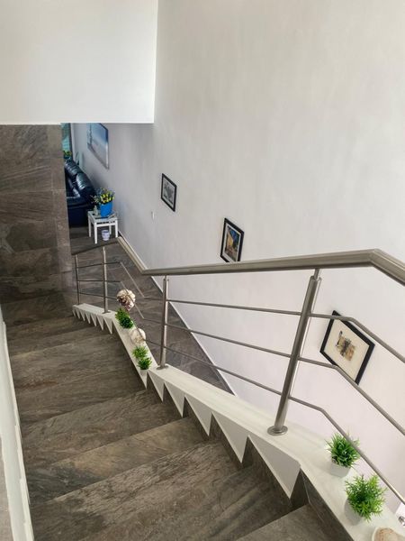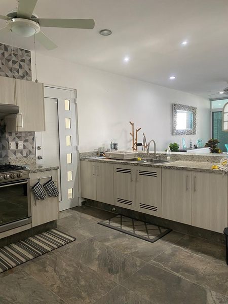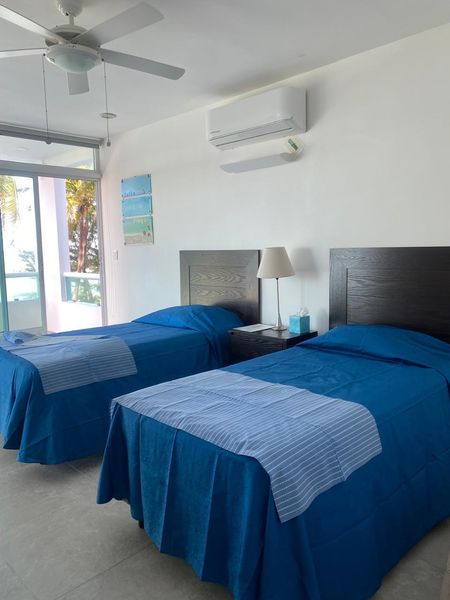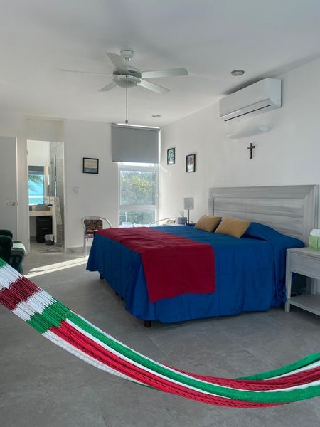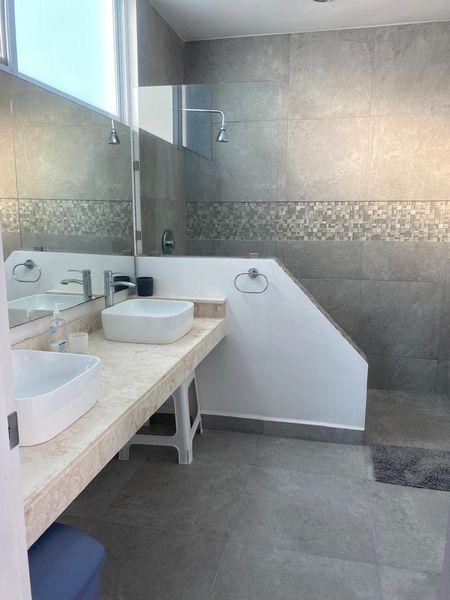Planta Baja. Pasillo de entrada a doble altura con puerta de aluminio blanco, sala-comedor con ventilador de techo cada uno, cocina integral equipada con alacena y paredes con recubrimiento, recámara con baño completo, sala y comedor corridos completamente amueblado, terraza con hamaqueros y vista al mar, cuarto de servicio con baño completo y centro de lavado, pasillo lateral, cuarto de máquinas para piscina y calefacción. Planta Alta 3 recámaras con baño completo c/u, terraza con vista al mar. Equipamiento. Climas (5) y ventiladores en toda la casa(7) Persianas, mosquiteros, carpintería de puertas (madera de encino), closet de blancos. INSTALACIONES ESPECIALES