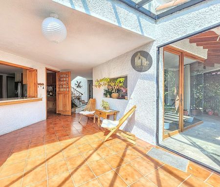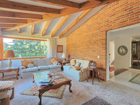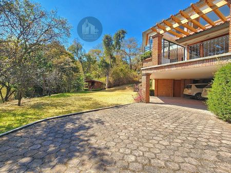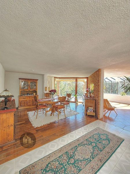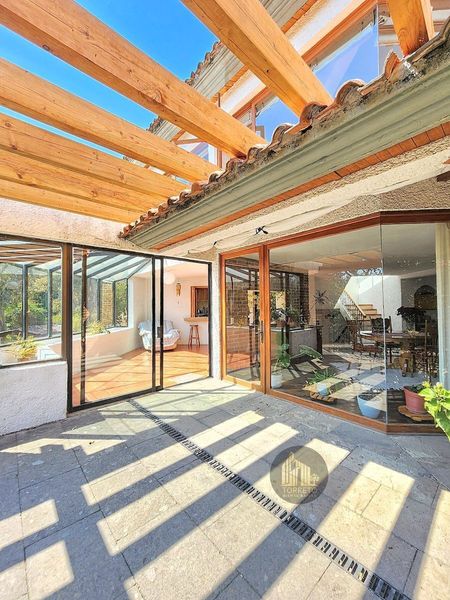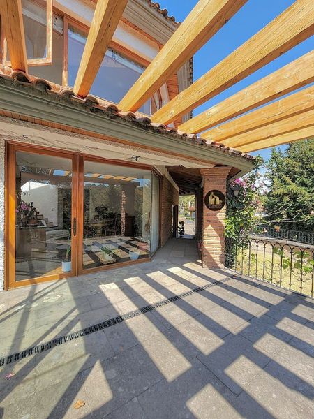 La casa cuenta con amplios espacios y techos de doble altura, se puede entrar por la cochera qué se encuentra junto al jardín en la parte posterior de la casa y por la entrada principal qué se encuentra al frente de la propiedad.