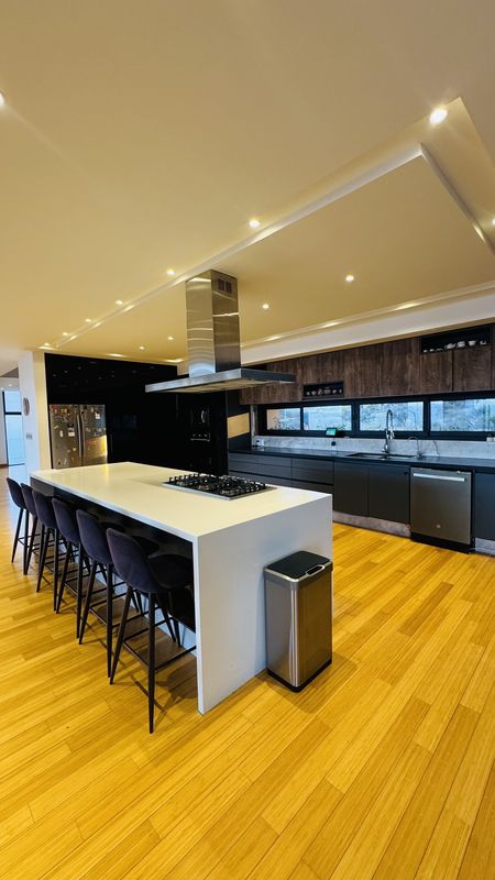 Cocina con barra de cuarzo, carpintería de alto brillo, granito negro, backsplash de mármol, lavavajillas, doble tarja, parrilla de inducción, torre de hornos, iluminación indirecta y ventilación