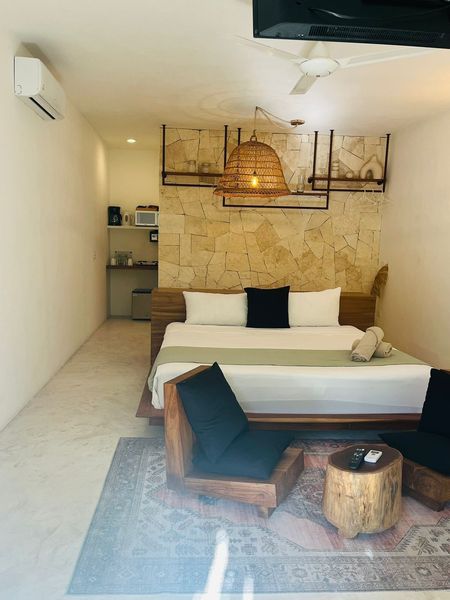Cuenta con cama King SIZE, sillón, mesa de centro, frigobar, ventilador de techo,