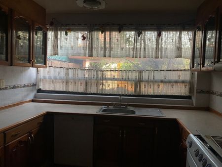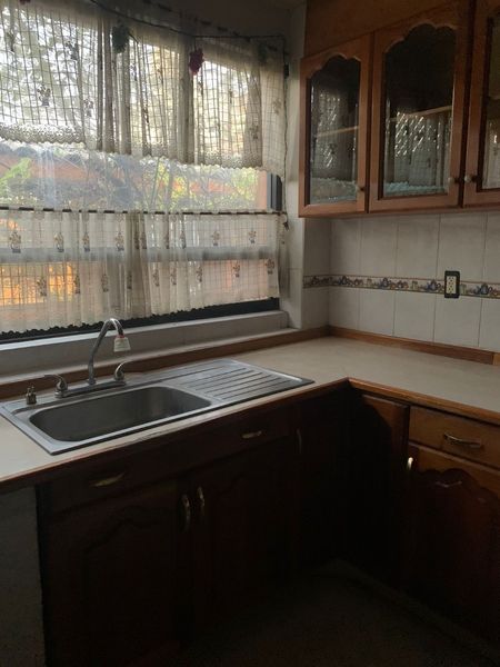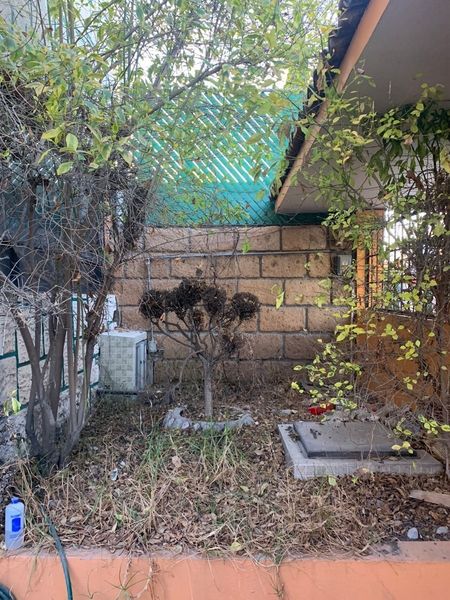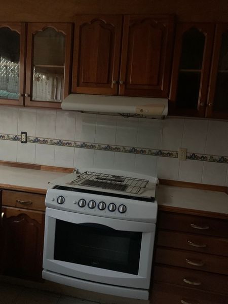 Primer nivel: Cocina integral con estufa y campana, espacio para sala y comedor, medio baño, espacio para bodega y  jardín con árbol de durazno y chiles, con escalera que conecta al área de lavado,