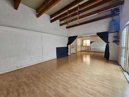 Salón acondicionado con duela, ventiladores, lámparas, espejos, y dos accesos, con altura la mitad de 3 metros y la otra de 5 metros.