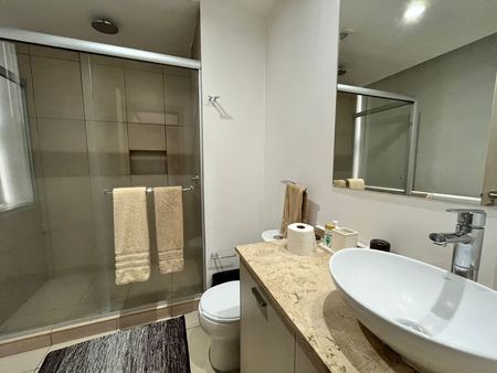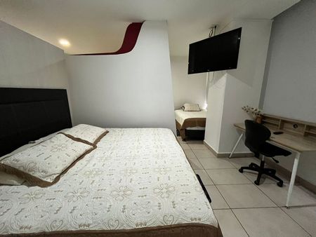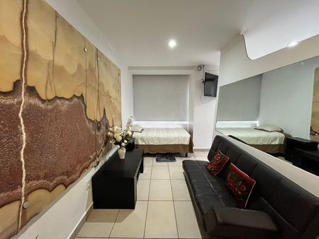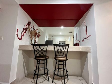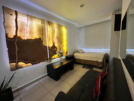 Amplio clóset, Persianas black out en todo el departamento, Smart TV, Baño completo, Cocina totalmente equipada, Barra desayunadora con bancos, Escritorio con silla de trabajo, Área de sala/estancia, Muy silencioso, ya que da a calle trasera y cuenta con ventanas aislantes.