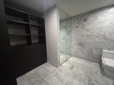 Baño de mármol travertino con puertas de regadera de cristal templado.