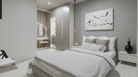 1 Recámara con clóset, cajoneras y piso de mármol travertino pulido mate