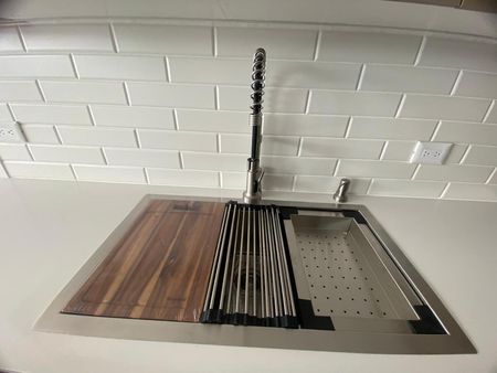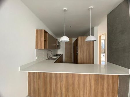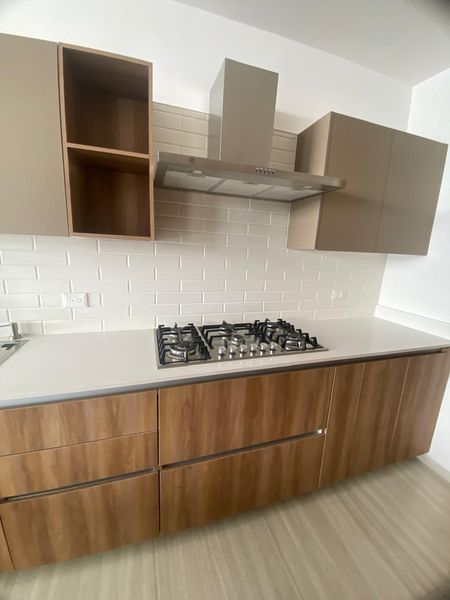 Cocina integral con barra desayunadora y cubierta de cuarzo blanco
