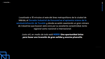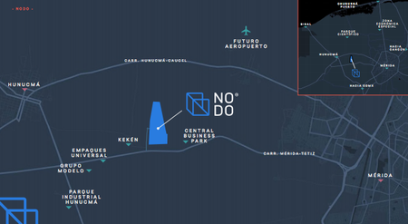 NODO será un complejo de lotes para uso logístico, comercial e industrial ubicado a un costado de la carretera Tetiz-Mérida que interconecta los subcentros urbanos de Hunucmá y Ciudad Caucel, zona de explosivo crecimiento industrial, con el Anillo Periférico de Mérida.