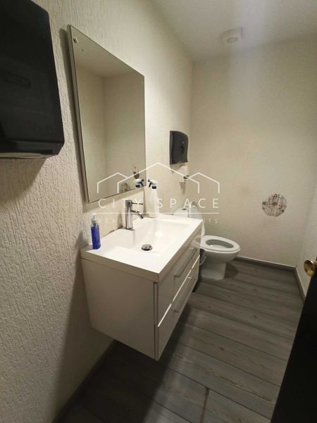 Planta Baja. Tiene 180 M2 de área rentable, ocupados actualmente con recepción, sala de juntas, oficinas privadas, bodega, cuarto de limpieza, comedor, área abierta de trabajo, 2 baños. Al frente encuentra el estacionamiento con portón eléctrico (de 60 M2).
