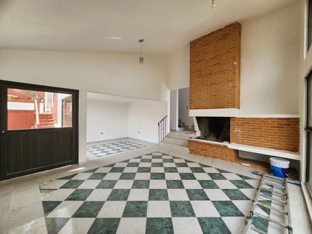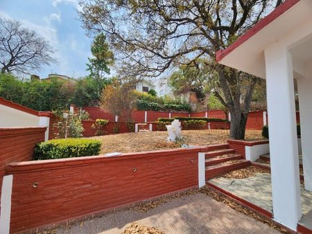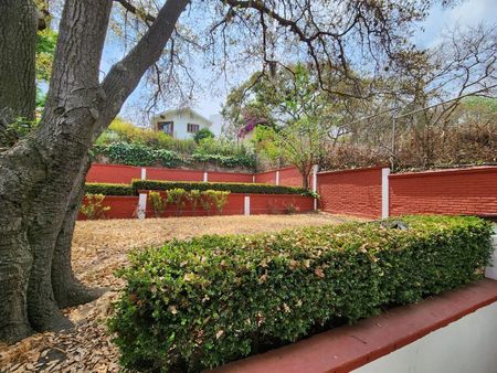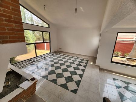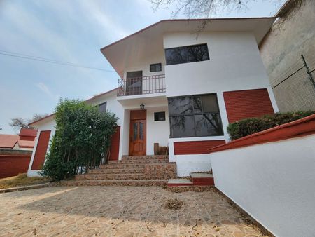 Casa en renta, sala con chimenea, comedor independiente, amplia cocina con espacio para antecomedor, amplio jardín, espacio para dos autos, bodega, área de lavado, tres baños completos, tres recámaras y estudio.