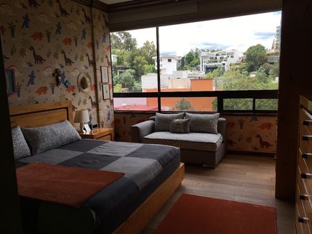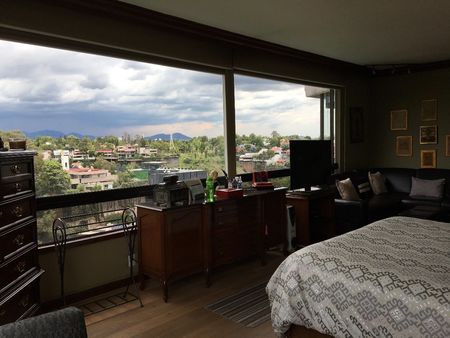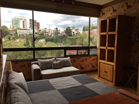 PENTHOUSE CON VISTA VERDE DE TODO EL DEPARTAMENTO. 2 NIVELES. EN NIVEL BAJO 3 RECAMARAS, LA PRINCIPAL CON SALITA PROPIA Y VESTIDOR. LAS OTRAS 2 RECAMARAS CON CLOSET. BAÑO COMPLETO EN CADA RECAMARA. SALA, COMEDOR Y FAMILY O BIBLIOTECA, AREA DE SERVICIO. TECHOS ALTOS. PISOS DE MADERA  Y MARMOL. MUEBLES DE MADERA EMPOTRADOS. CANTINA. EN SEGUNDO NIVEL CUARTO DE JUEGOS CON MEDIO BAÑO Y COCINETA. GRAN TERRAZA DE 200 MTS, PARTE TECHADA CON BARRA. PRECIOSA VISTA. 4 LUGARES DE ESTACIONAMIENTO. CALEFACCION CENTRAL. EN LOS 803 MTS. VIENE INCLUIDA LA TERRAZA Y LOS LUGARES DE ESTACIONAMIENTO. PERFECTO ESTADO DE CONSERVACION.  AREAS COMUNES: ALBERCA CUBIERTA, GIMNASIO, SALON DE FIESTAS, JARDIN, CANCHA DE TENIS. SOLO 13 DEPARTAMENTOS. SE ACEPTAN MASCOTAS SEGUN LA MASCOTA.  MUY EXCLUSIVO. UBICADO POR  LA IGLESIA DE LOURDES. EL MANTENIMIENTO VIENE INCLUIDO EN EL PRECIO DE RENTA. SE PUEDE RENTAR CON ALGUNOS MUEBLES.