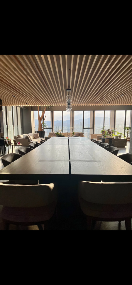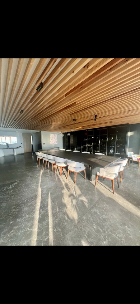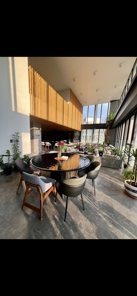 En la primera planta, se encuentra el área social sala-comedor que destaca por sus techos de triple altura y un alambrin de madera que le aporta un toque organico entre el lujo de los acabados,brinda una sensación de amplitud y elegancia.