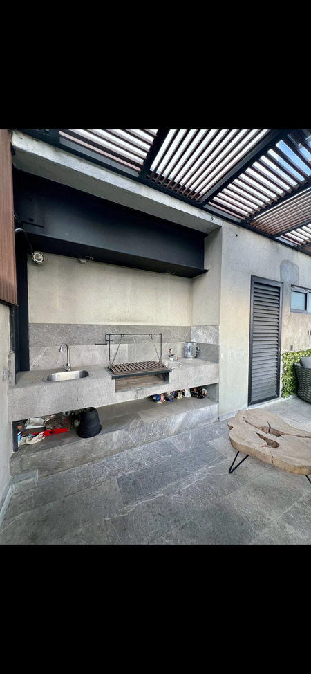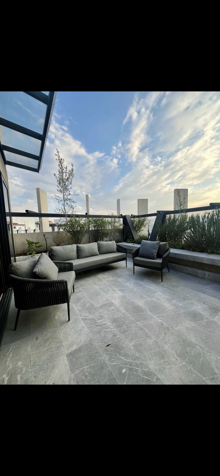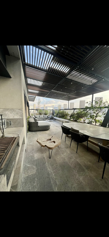 En la tercera planta, se encuentra la última recámara (actualmente utilizada como otro family room pero puede ser ocupada como recámara principal), un refugio de lujo y comodidad, con un vestidor grande que ofrece suficiente espacio para toda su colección de ropa y accesorios. El baño completo de esta recámara cuenta con dos W.C con privacidad y vapor, en esta misma planta podemos contemplar una espectacular terraza semi techada con vista a las montañas para disfrutar de una deliciosa carne asada o una hermosa velada, equipada con asador y paneles solares que reducen el consumo de luz del departamento al 100%, perfecta para disfrutar del aire libre con privacidad.