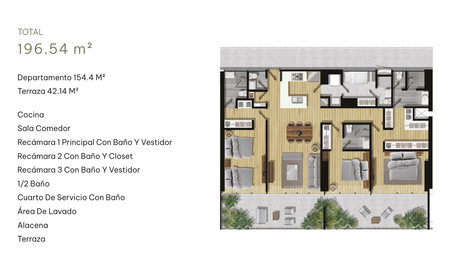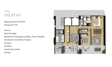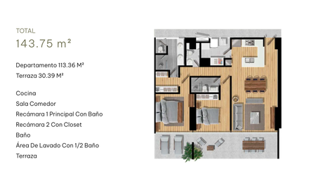 Departamentos de 2 a 3 recamaras con baño completo y terraza , sala -comedor con terraza, cocina equipada, jardín, estacionamiento de 2 a 4 autos.