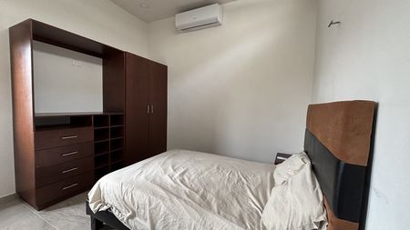 2 recámaras con cama matrimonial amuebladas con aire acondicionado, ventilador y closet de pared vestido con baño completo