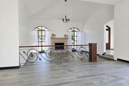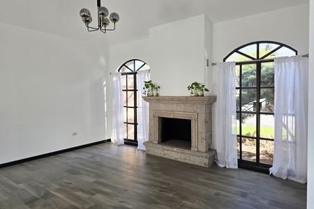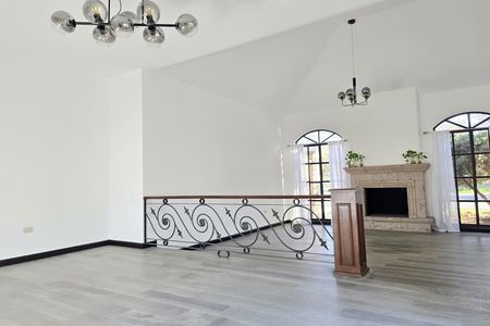 Sala de doble altura con chimenea de leña con tiro al exterior y vista a la Plaza principal